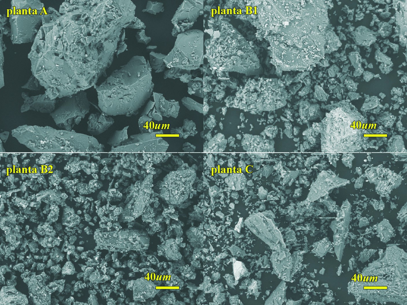 Imágenes de microscopía electrónica de barrido (SEM, por sus siglas en inglés) de cuatro relaves de minas diferente